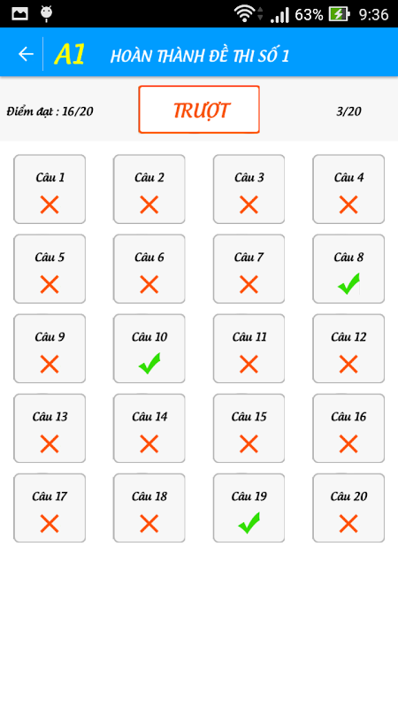 - Thi xong 30 câu là hiển thị đáp án Trượt hay Đỗ để tham khảo và đánh giá trình độ.