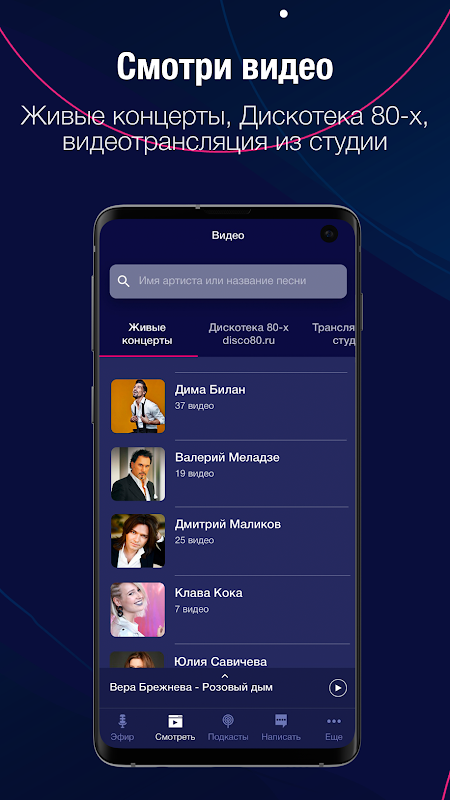 ∙ شاهد مباشرة في التطبيق مقاطع فيديو للحفلات الحية للفنانين ، وتسجيلات المهرجانات ذات العلامات التجارية "ديسكو الثمانينيات" ، وبث الفيديو على مدار الساعة من استوديو في موسكو