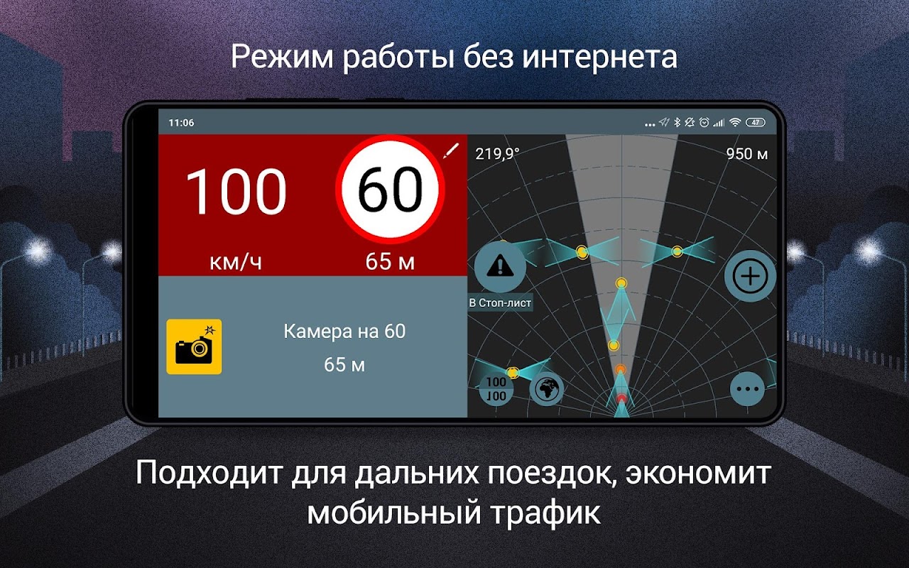 يعمل Antiradar M في الخلفية ، بالتزامن مع برامج الملاح. يحذر من الكاميرات عن طريق الصوت عبر البلوتوث ، وسماعة الهاتف ، و AUX