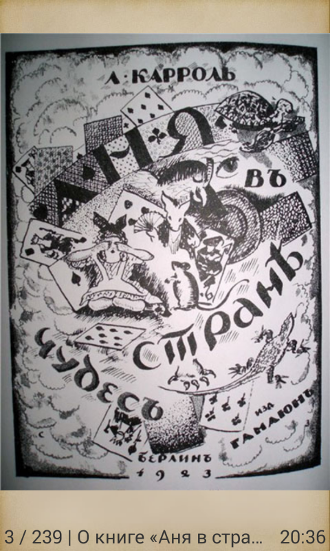 هذه الترجمة الرائعة والجميلة لحكاية لويس كارول الخيالية الشهيرة "مغامرات أليس في بلاد العجائب" قام بها فلاديمير نابوكوف في عام 1923. لم يتم نشره مطلقًا في اتحاد الجمهوريات الاشتراكية السوفياتية وهو غير معروف عمليًا للقراء. في رواية نابوكوف للحكاية، أصبحت أليس هي أنيا وبدأت تعيش حياة جديدة.