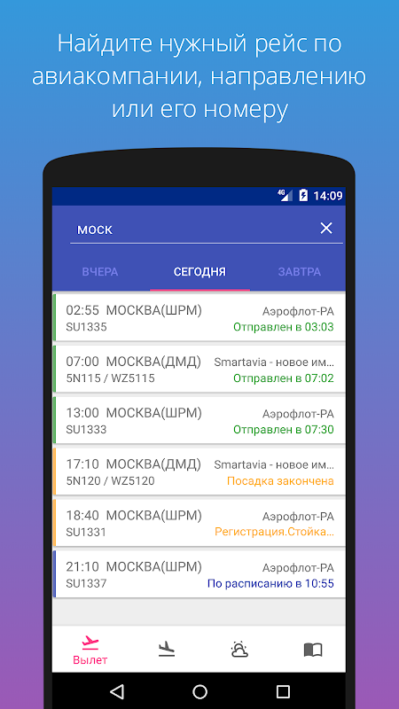 В онлайн-табло есть поиск по следующим ключам: номер рейса, авиакомпания, направление полёта (аэропорт назначения).