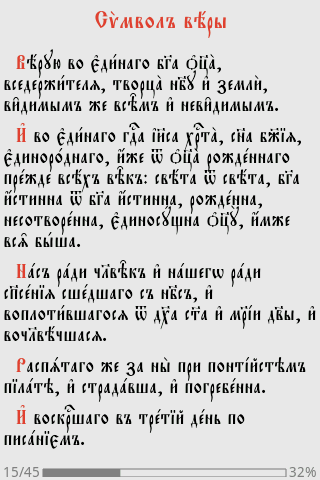 يتيح لك التطبيق عرض نصوص الكتب المختلفة بلغة الكنيسة السلافية. يتم تنزيل الكتب من خادم بعيد وتخزينها على بطاقة SD بالجهاز لقراءتها لاحقًا في وضع عدم الاتصال.