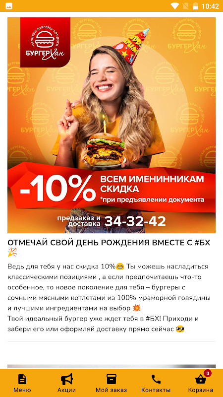 قم بترتيب توصيل أو استلام الوجبات الجاهزة في مطعم Burger Khan Komsomolsk-on-Amur. القائمة والنظام في التطبيق.