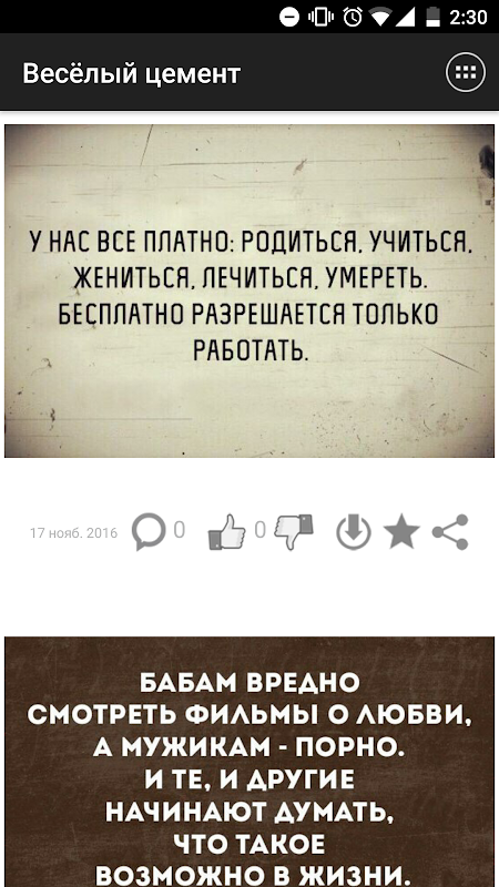 Понравившиеся записи можно комментировать и оценивать. Все понравившиеся картинки можно сохранять в галерее устройства в папке приложения. Ты можешь делиться записями с друзьями через социальные сети Facebook, Вконтакте, Одноклассники, Viber, WhatsApp а так же другие установленные на устройстве приложения. Ну и конечно, ты можешь оставлять лайки и сохранять записи в избранное.