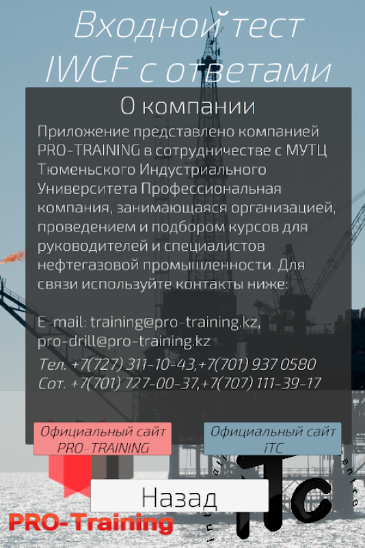 Данное приложение призвано проверить основные знания и навыки по управлению скважиной при бурении в соответствии со стандартами IWCF (International Well Control Forum, Великобритания).