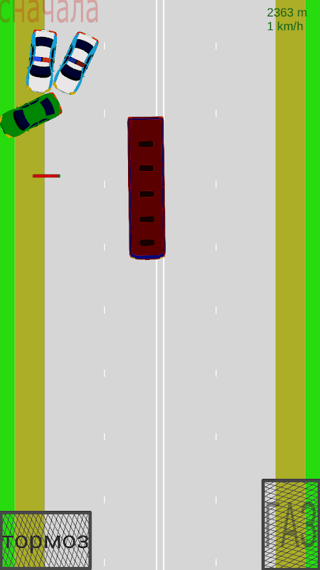 Управление сложное — повороты только наклоном телефона, ускорение и торможение — клавишами на экране.Игру можно перезапустить сначала, нажав на кнопку в верхней левой части экрана.