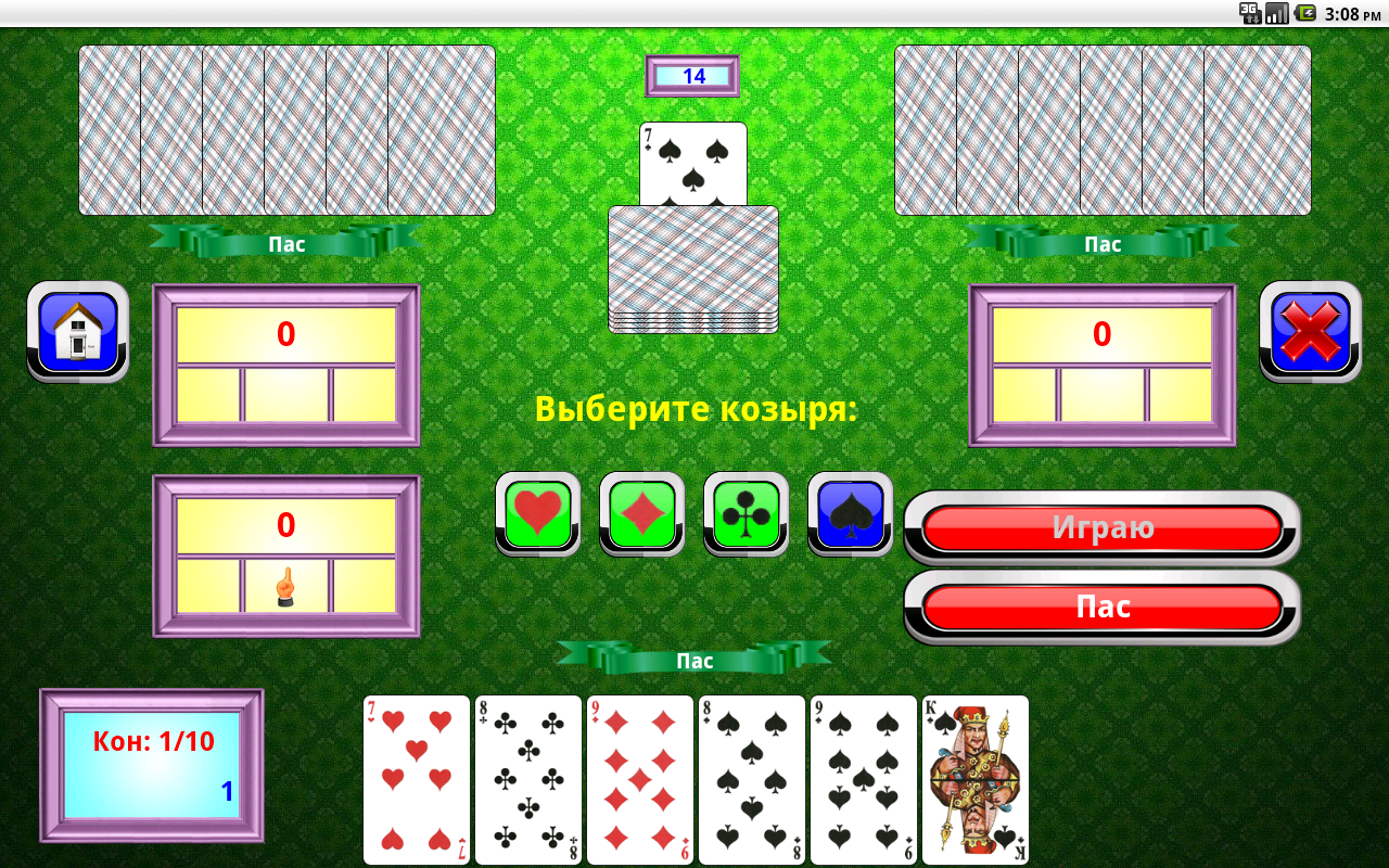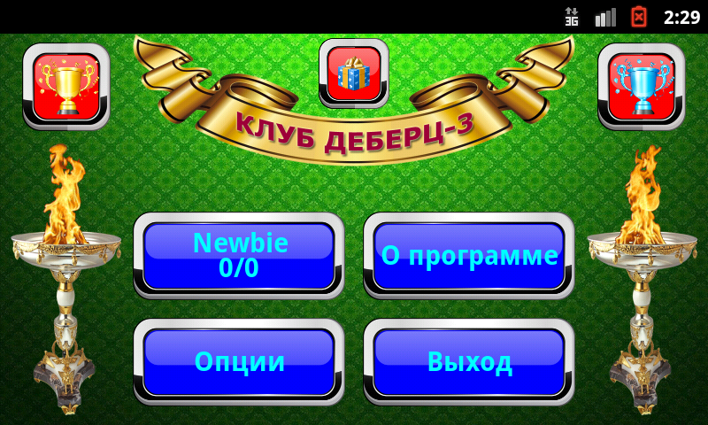 Интеллектуальная карточная игра "Деберц" втроём, популярная в России. Сыграв 25 конов при хорошем счёте игрок попадает как в локальную таблицу чемпионов, так и в мировую. Можно выбрать одну из трех любимых советских колод: Атласную, Майя или Славянскую. Требуется размер экрана 800x480 или лучший. Поддерживаемые языки: English + Русский.