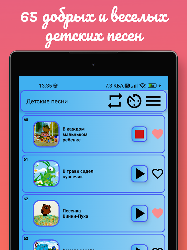 يحتوي تطبيق "موسيقى وأغاني من الكارتون" على المقطوعات الموسيقية التالية: