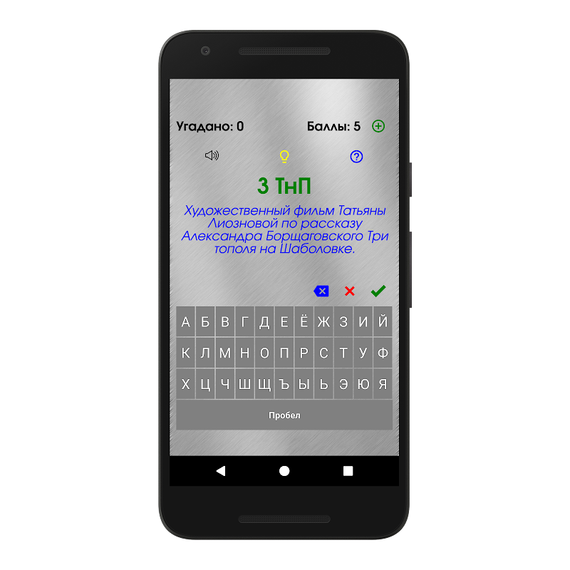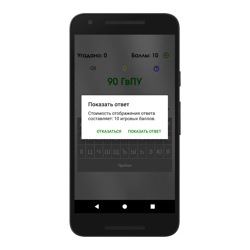 В начале игры игроку начисляется 10 баллов, которые он может использовать для получения подсказки либо ответа на загадку. Стоимость подсказки составляет - 5 игровых баллов; стоимость ответа на загадку - 10 игровых баллов.