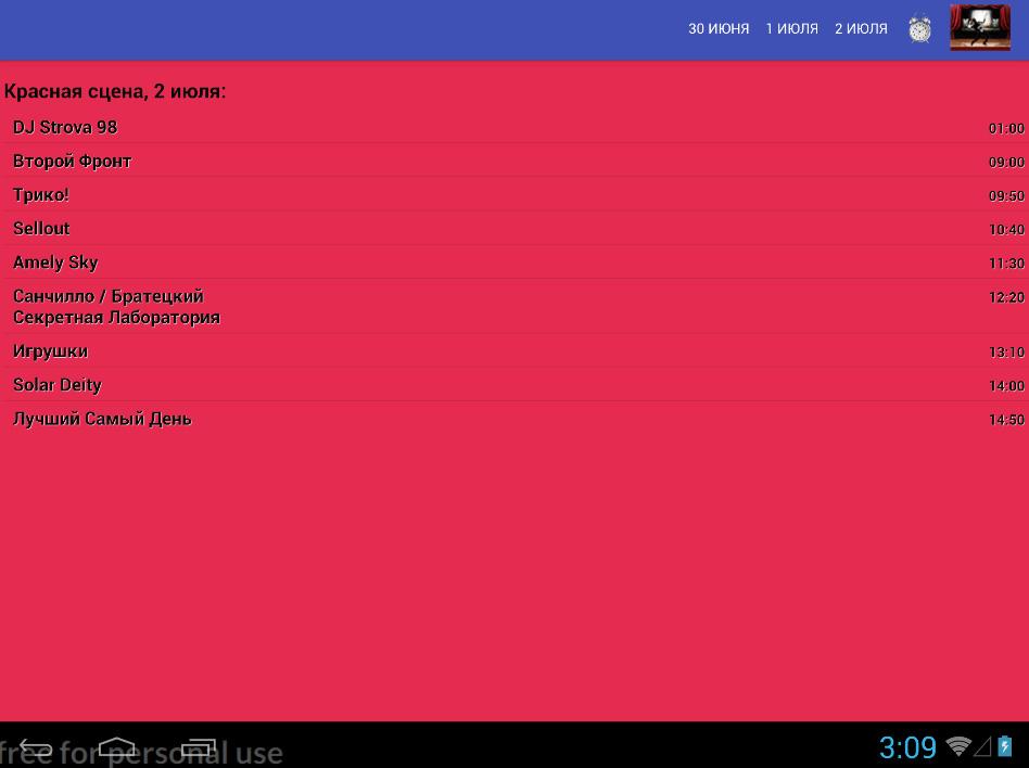Расписание фестиваля Доброфест 2017. Экспериментальная функция будильника тапом по названию группы.