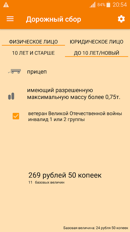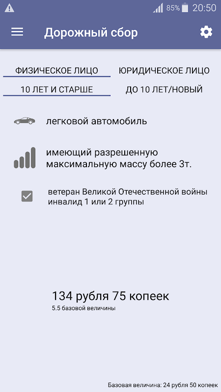 Приложение рассчитывает сумму дорожного сбора, как вида государственной пошлины, взимаемой при выдаче разрешения на допуск транспортного средства к участию в дорожном движении в Республике Беларусь.