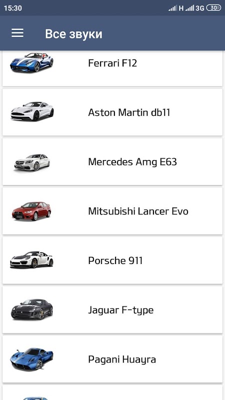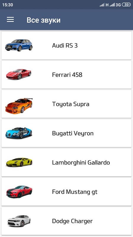 يقدم التطبيق نماذج من العلامات التجارية الأكثر شهرة ، مثل أودي ، بي ام دبليو ، مرسيدس ، فولكس واجن مكلارين ، فيراري ، لامبورغيني ومازيراتي. ولكن هذه ليست قائمة كاملة ، والتي يتم توفيرها في الملحق ، هنا يمكنك أيضا العثور على أصوات المحركات والنماذج الغريبة ، على سبيل المثال: Bugatti Veyron ، Pagani Zonda F أو Porsche Cayenne Turbo S.