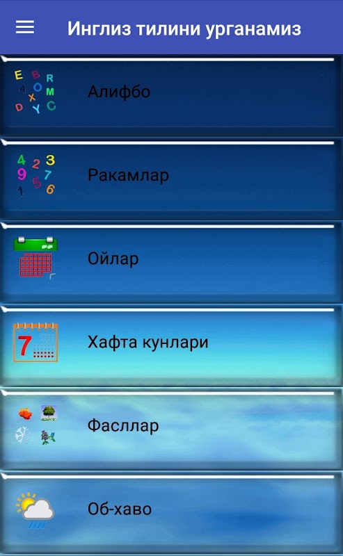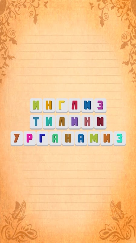 Bu dastur orkali siz ingliz tili harflari، sonlari، ranglar، oylar، shaklar wa boshkalarni urganishingiz mumkin. Har bir harf wa suz uchun alohida tovush yozilgan.