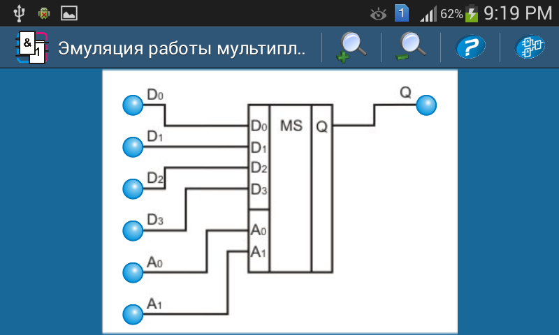 لمس أي جهاز إدخال يستتبع تغيير القيم من إشارة الدخل إلى أخرى: يتم استبدال وحدة من منطق الصفر، والعكس بالعكس. عرض قيم المتغيرات المنطقية المدخلات وجهاز الإخراج هو مؤشر اللون: الأزرق LED يتوافق مع منطقية 0 والأحمر - المنطق 1، والرمادي - انتاج دولة مقاومة عالية.