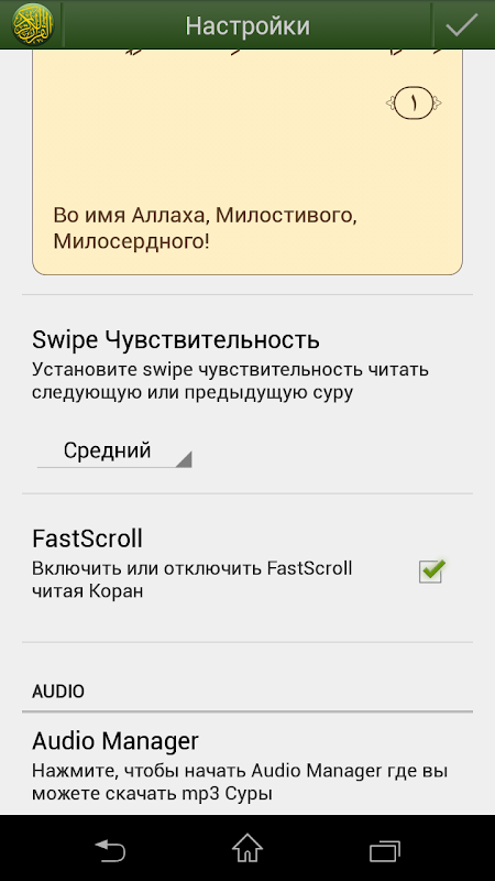 - Можно воспроизводить аудиозапись любого аята с того места, где Вы остановились.