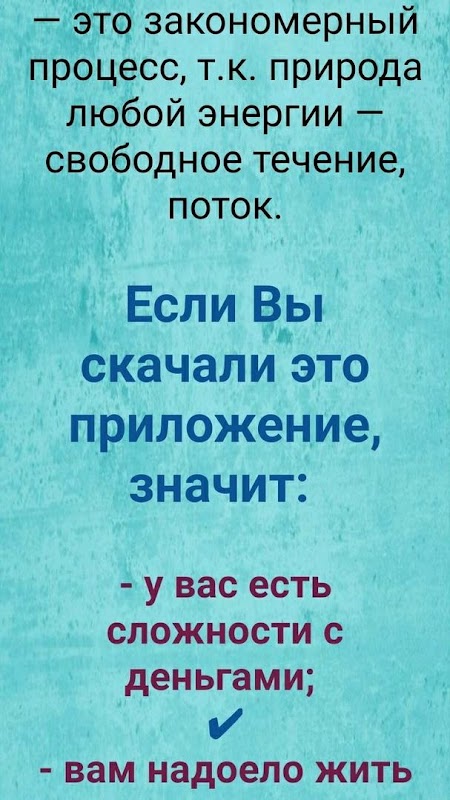 Вы узнаете, что вам мешает свободно пропускать через себя поток энергии денег. Что за причина -порча, крадник, сглаз, негативные убеждения? Что именно вам мешает жить той жизнью, которой вы хотите жить? В приложении есть информация, которая поможет вам разобраться что именно является причиной блокировки вашего денежного потока. А так же, как снять самостоятельно порчу сделанную на деньги, и способ привлечь деньги.