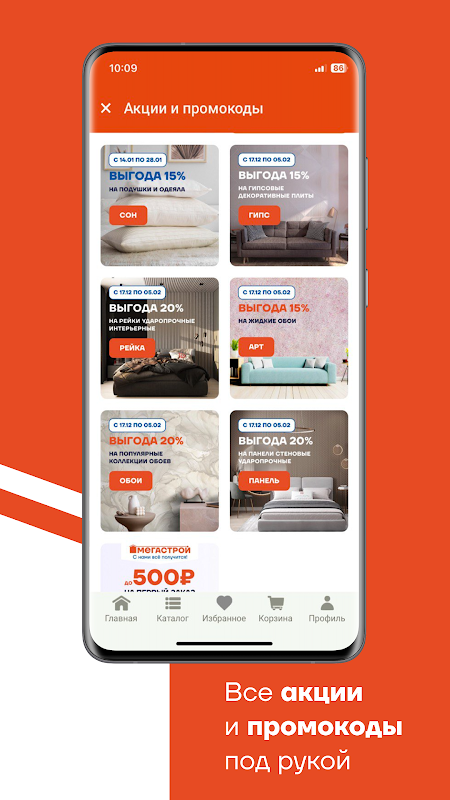 أكثر من 67000 منتج في محلات السوبر ماركت MEGASTROY للبناء والإصلاح. دائمًا ما تكون السلع للمنزل والحديقة في متناول اليد مباشرة من هاتفك المحمول. بيك أب من 12 هايبر ماركت. تسليم مريح للبضائع في يوم الطلب ، وكذلك التسليم في جميع أنحاء روسيا.