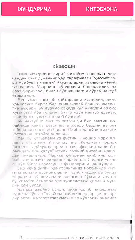 Мен бу қўлёзмани ўз дўстим - ношир Марк Ал- ленга жунатдим. У яқиндагина "Келажаги порлоқ бизне< тадбиркорларнинг муваффақиятлари бо- оасидаги бошқарув" номли ажойиб китобни нашр- дан .иқарганди. Маркка қўлёзмам ёқибгина қол- мом, уьи босиб чиқариш жараёнида ўзидаги улкан ва Бир неча ойлик ҳамкорлигимиз мобайнида кўп- гина хомаки вариантларни тузиб чиқдик ва бунда Маркнинг қўшимчалари анчагина бўлгани учун у бу китобга бемалол ҳаммуаллифлик қилиши мум- кин ҳам бўлди.