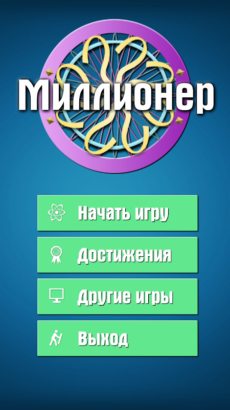 Миллионер — аналог всем известной интеллектуальной игра. Отвечайте на более чем 1500 вопросы викторины, постепенно продвигаясь ближе к главному призу в один миллион. На каждый вопрос предлагается 4 варианта ответа, нужно выбрать только один! В помощь предлагаются 3 вида подсказок! Удачи на пути к миллиону, Счастливчик!