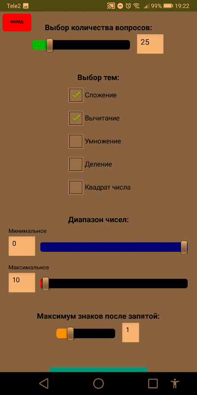 يمكنك ضبط مدى تعقيد الأمثلة وعددها. يحتوي التطبيق على آلة حاسبة لإجراء العمليات الحسابية في خطوة واحدة.