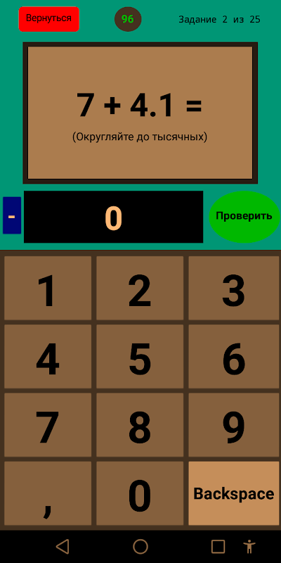 سيتم إعطاؤك أمثلة ، يجب أن تقدم إجابات لكل منها في غضون 100 ثانية. يمكنك حل مسائل الجمع والطرح والضرب والقسمة والتربيع. في التحديثات المستقبلية ، يمكن إضافة وظائف مثل العثور على الجذر وقوة 2.