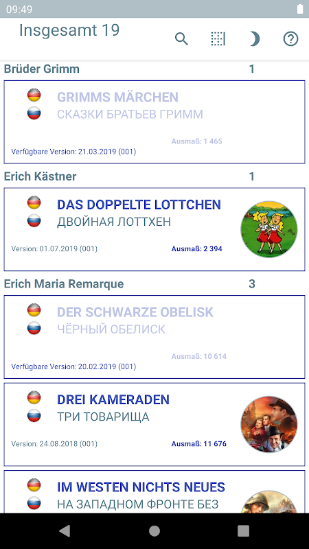 تعد القراءة المتوازية ، وفقًا لعدة لغات ، واحدة من أكثر الطرق فعالية لتعلم اللغة ، ويلجأ المزيد والمزيد من الناس إلى هذه الطريقة. يحتوي هذا التطبيق على كتب غير مقتبسة باللغة الألمانية مع ترجمة موازية. ومع ذلك ، نظرًا لعدم تكييف النصوص ، قد لا تكون طريقة القراءة الموازية مناسبة لأولئك الذين لا يكون مستوى معرفتهم باللغة جيدًا بدرجة كافية. إذا كنت واثقًا بما فيه الكفاية من اللغة ، وكثيراً ما تلجأ إلى القاموس للحصول على المساعدة ، وإذا كنت ترغب في قراءة وتريد أن تشعر بهذه اللغة ، فهذا التطبيق مناسب لك. وستكون الواجهة المريحة وغير المألوفة للتطبيق ، بالإضافة إلى الوظيفة غير المتوفرة في التطبيقات الأخرى المماثلة ، مساعداً لك في هذا المسار.