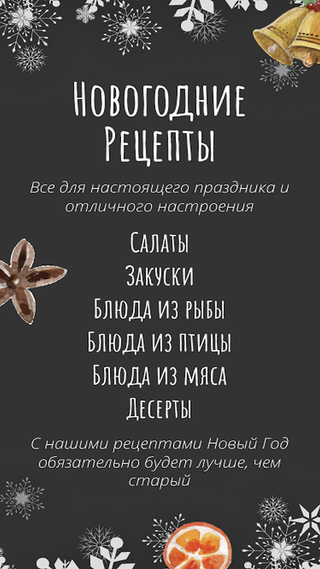 Составьте новогоднее меню. С чего начинается новогодний стол? Салаты и закуски. Когда салаты позади - подавайте первые блюда, суп в Новый 2019 Год - это тоже празднично. Вторые блюда - из курицы, свинины, баранины, телятины, говядины - наши рецепты помогут приготовить все удивительно вкусно. Кстати, 2019 Новый Год - это год свиньи, так что кулинарные блюда из свинины в этот раз в фаворе. Даже если вы не умеете готовить - есть простые, легкие и быстрые рецепты, от этого не менее праздничные. Те же новогодние бутерброды и канапе добавят позитива и ощущения настоящего праздника. Ведь главное в новогоднем меню - хорошее настроение и отличные новогодние рецепты. Удачный кулинарный рецепт - удачный 2019 Старый Новый год и Рождество.
