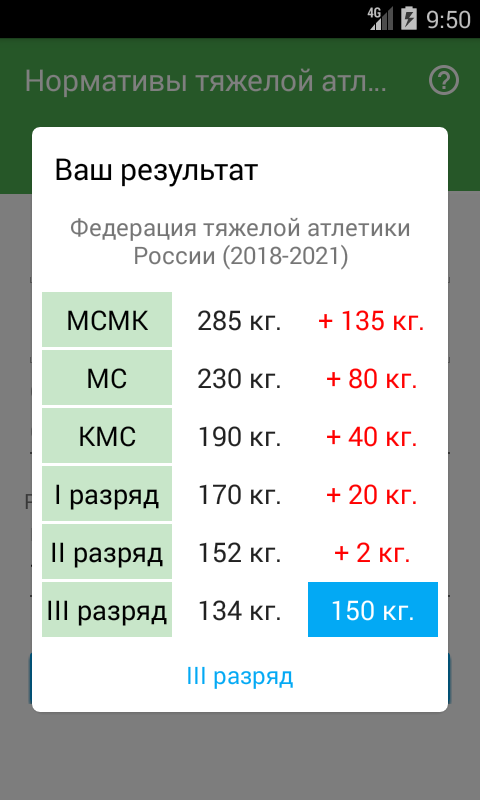 С помощью этого приложения можно узнать о своих достижениях в дисциплине Тяжелая атлетика. Посмотри текущие нормативы, введи свой пол, возраст и максимальные результаты в толчке и рывке - и узнай свой спортивный разряд.