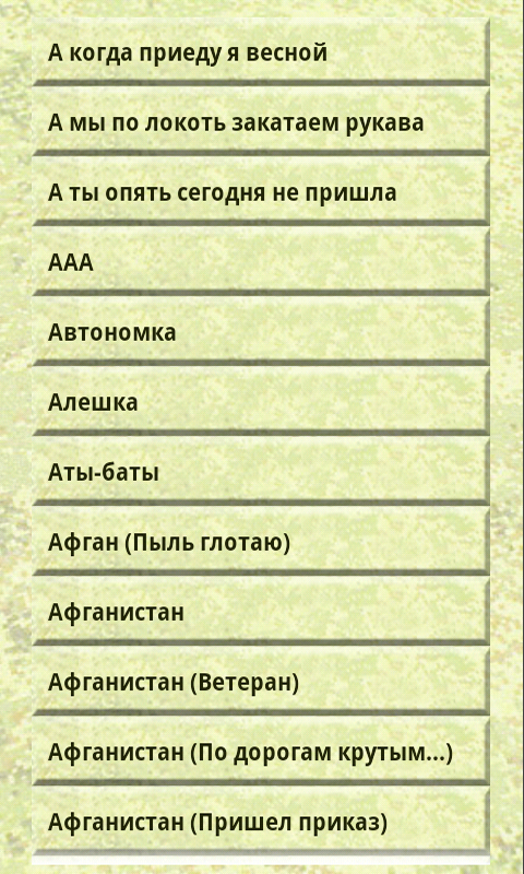 Если в Вашей компании есть место для гитары и душевных песен, то это приложение для Вас! Наше приложение - удобный армейский песенник с аккордами для гитары. Все песни расположены в алфавитном порядке и даже если Вы вдруг забыли, как называется композиция, то благодаря удобному поиску можно с легкостью ее найти.