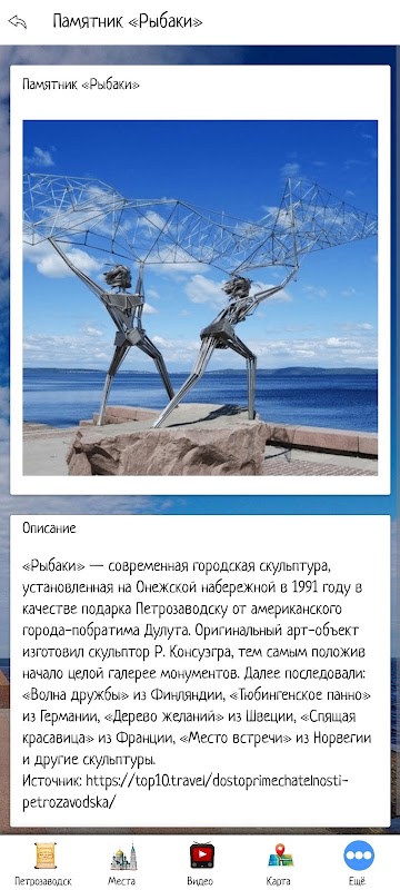 في هذا التطبيق ، يمكنك التعرف بشكل أولي على Petrozavodsk و Karelia ، واختيار مكان لرحلة من خلال مشاهدة المعالم ومراجعات الفيديو. تعرف على تاريخ مدينة بتروزافودسك وكاريليا. يحتوي التطبيق أيضًا على معلومات حول الوكالات السياحية والفنادق التي تقدم خدماتها في بتروزافودسك ، كاريليا.