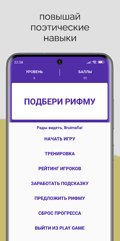 كل مستوى عبارة عن كلمة واحدة تحتاج إلى إيجاد 10 قوافي لها. إذا لم يكن اليوم هو يومك فجأة وخيبتك ذاكرتك ، يسعد ألكسندر سيرجيفيتش دائمًا بالقدوم إلى الإنقاذ. بعد اجتياز المستوى ، يمكنك العودة إليه في وضع التدريب ، وبالتالي كسب النقاط والتنافس مع المستخدمين الآخرين على لقب أفضل ريمر. من الممكن أيضًا شراء النسخة الكاملة من التطبيق ، وبالتالي التخلص من الإعلانات وتقديم لفتة لطيفة للمطورين!