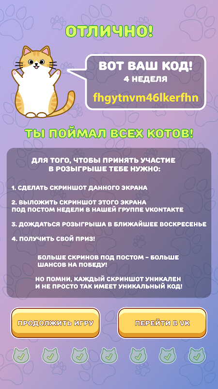 В приложении Поймай котика мы еженедельно разыгрываем общий призовой фонд 11 500 рублей, и распределяем эти деньги среди 7 призовых мест. Отзывы победителей с подтверждением в виде скриншотов выплат, вы сможете найти в нашей группе Vk, в обсуждениях группы, которое называется “Отзывы победителей”.