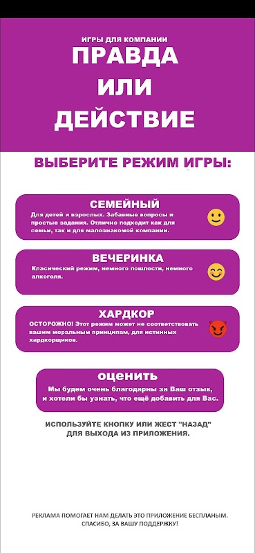 هذا تطبيق جديد أو طبعة جديدة أو تكملة للعبة Truth أو Dare Game ، والتي تقدم أوضاعًا ، وكلها مجانية. لا توجد إعلانات مزعجة وإعلانات بينية ومجموعة من المهام الجديدة.