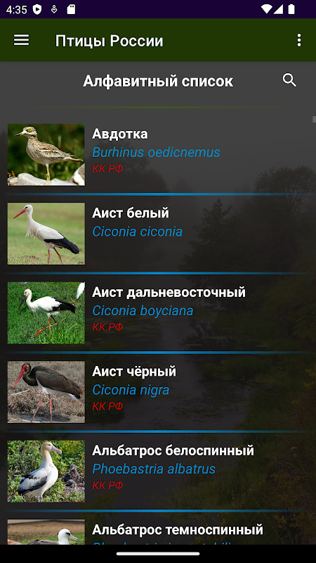 دليل طيور روسيا ، والذي يقدم قائمة كاملة من الطيور الروسية مع الصور والأوصاف والأصوات. لا يعرض الكتاب المرجعي التعشيش فحسب ، بل يعرض أيضًا الأنواع الشتوية والمهاجرة والمتشردة.