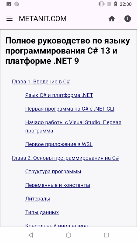 دليل للغة البرمجة C# الذي يصف جميع المفاهيم الأساسية للغة. مخصص للمبتدئين وأولئك الذين هم بالفعل على دراية بهذه اللغة. يمكن استخدامه كمرجع أو دليل للدراسة الذاتية.