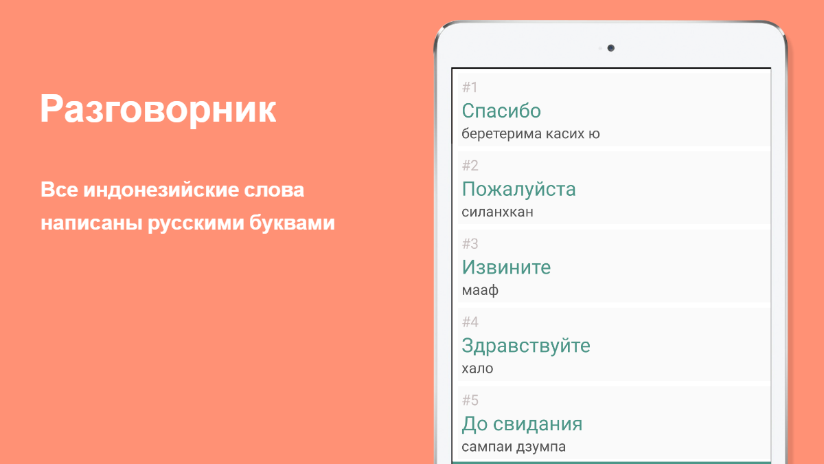 Русско-индонезийский разговорник можно использовать соответственно, как разговорник, так и инструмент для изучения индонезийского языка. Все индонезийские слова написаны русскими буквами и разбиты на 6 логических тем, то есть разговорник рассчитан на русскоговорящего пользователя (туриста).