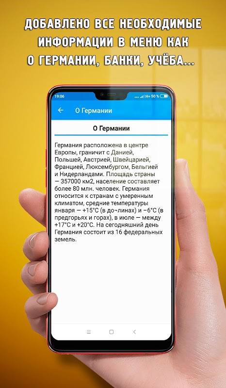 يعمل التطبيق بدون اتصال بالإنترنت . لراحة المستخدمين ، تم تقسيم المواد إلى 64 فئة مهمة. يحتوي على أكثر من 2200 عبارة منطوقة بالألمانية والروسية ، كما يحتوي على نسخ باللغة الروسية.
