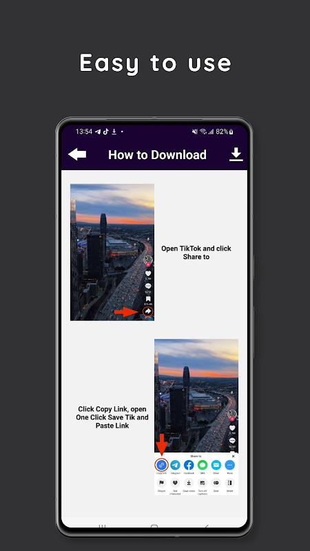 ما عليك سوى نسخ ملف الفيديو من TT، ثم قم بتثبيته في التطبيق ثم اضغط على "التنزيل". ستستغرق كل العملية كل ثانية!