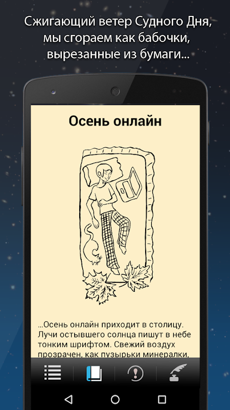 В этом приложении вы сможете читать это произведение и рассмотреть иллюстрации, сделанные автором. И так же послушать его в исполнении автора. После запуска оно скачает все необходимые аудио файлы и будет работать вне сети.