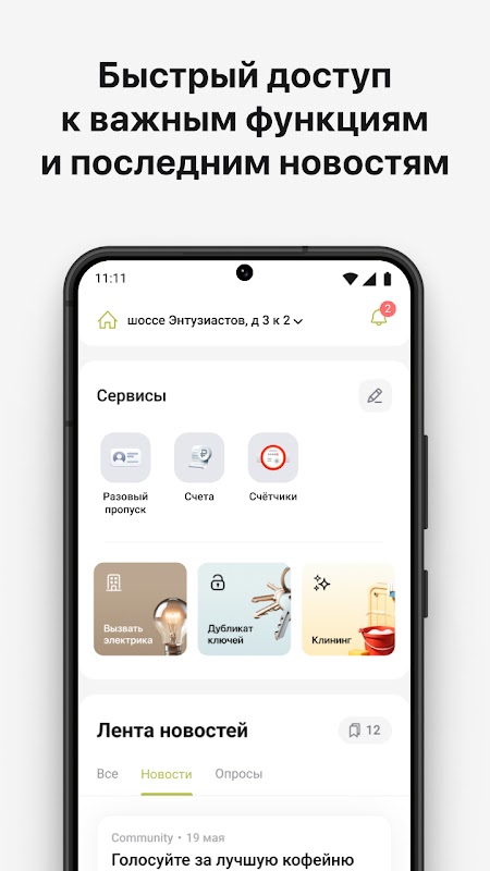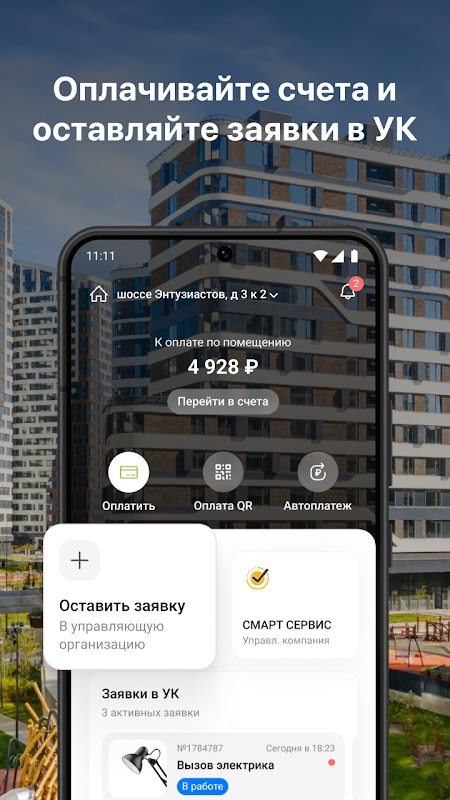 باستخدام تطبيق الهاتف المحمول، يمكنك اختيار شقة من المطور DONSTROY، وكذلك طلب خدمات شركات الإدارة لمجموعة SMART SERVICE.