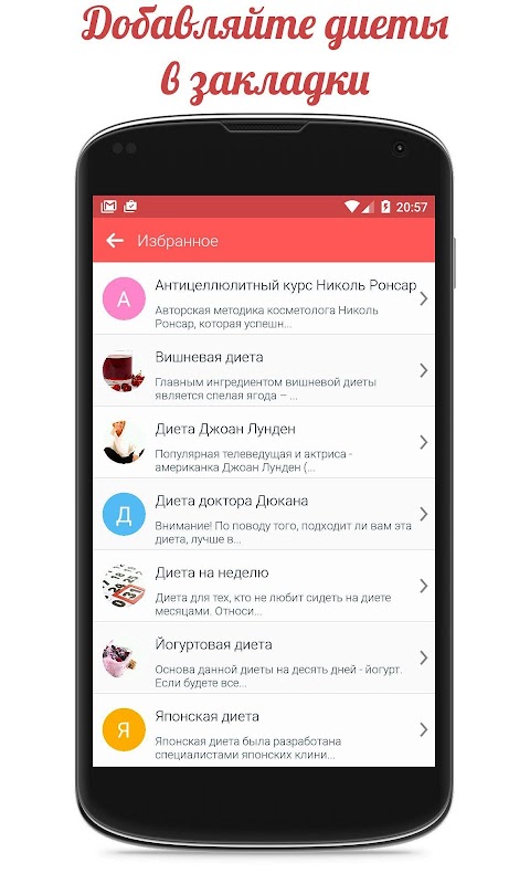 В приложении есть закладки и удобный поиск по названиям диет, так что Вы всегда сможете найти то, что Вам нужно и не потерять!
