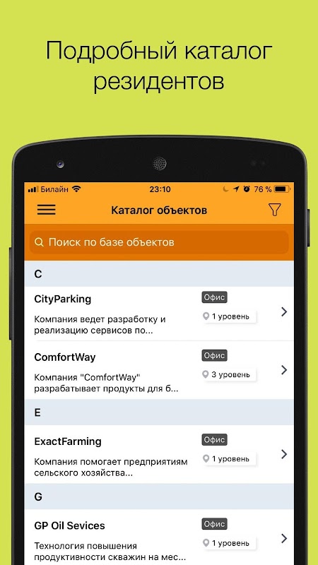 Приложение позволяет осуществлять навигацию по зданию, прокладывать маршрут до офисов интересующих компаний, быть в курсе будущих и прошедших мероприятий.