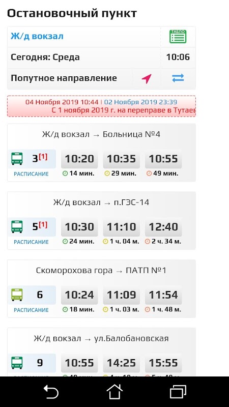 يُظهر أقرب ثلاث رحلات عبر الإنترنت ، وهي وسائل النقل العام في المناطق الحضرية لمدينة ريبينسك ، وضواحيها (وفقًا لجداول الرحلات).
