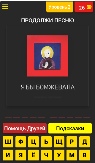 Почти каждый из нас любит слушать музыку, а кто то даже подпевает своим любимым песням :) Попробуй проверить, на сколько хорошо ты знаешь слова популярных песен. В игре будут представлены обложка и некоторые слова из песни, Вам необходимо вставить пропущенные слова. Может легко на первый взгляд? Проверь!