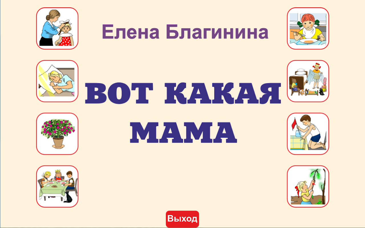 Эта развивающая игра поможет ребенку выучить детские стихи Е. Благининой. Послушайте и выучите эти знакомые всем с детства стихи вместе со своим малышом. Простая в использовании игра позволит ребенку самому выбирать и прослушивать стихи. Все стихотворения сопровождаются красочными картинками.