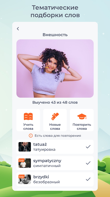 بغض النظر عن مستوى معرفتك باللغة البولندية، يمكنك تحسين مفرداتك من خلال الدراسة لمدة 10-15 دقيقة يوميًا. عند إكمال المهام، لن تتعلم كلمات جديدة فحسب، بل ستكرر أيضًا المواد التي تمت تغطيتها مسبقًا بانتظام. يمكنك بشكل مستقل تحديد الكلمات التي تحتاج إلى تعلمها أولاً وإنشاء مجموعات شخصية من الكلمات التي تناسب احتياجاتك.