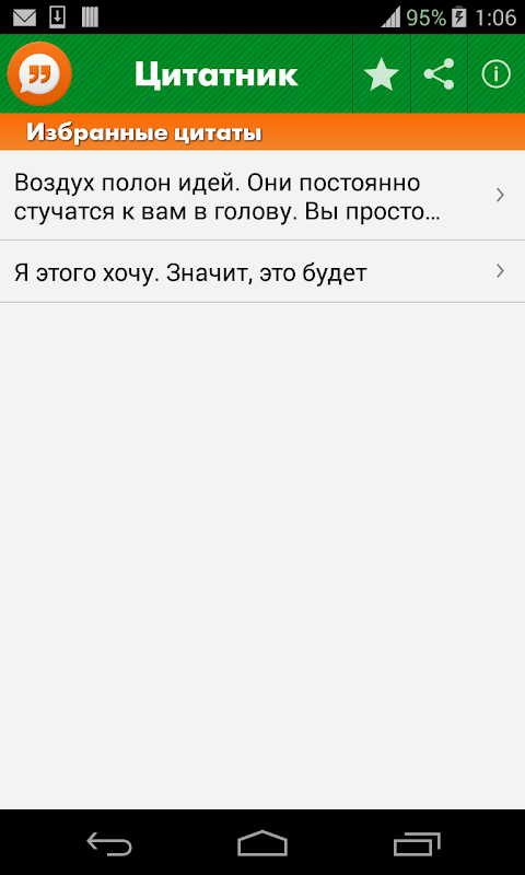 Установи приложение – и поднимай себе настроение удачной цитатой или любимой фразой из сериала. Добавляй цитаты в избранное и делись мудрыми мыслями с друзьями в соцсетях или с помощью смс.