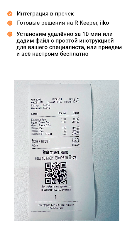 Мы бесплатно изготовим и доставим в любой город, в любом количестве визитки с qr-кодом, тейбл-тенты, наклейки. Организациям на программах R-Keeper или iiko выведем QR-код в пречек за 10 мин или дадим простую инструкцию для специалиста.
