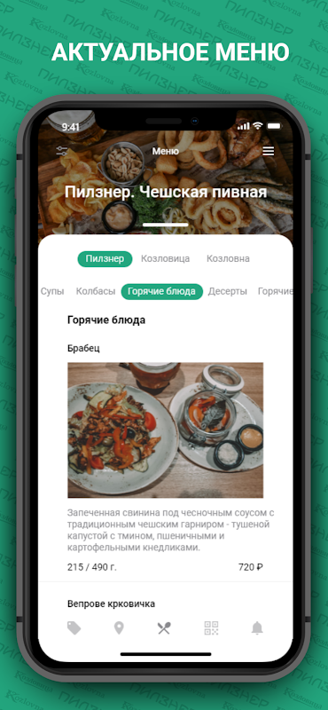 هذا أحد تطبيقات مطعم Pivne التشيكي القابضة ، الذي يوحد ثلاث سلاسل من المطاعم للمأكولات التشيكية التقليدية في موسكو: بيلسنر ، كوزلوفيتسا وكوزلوفنا.