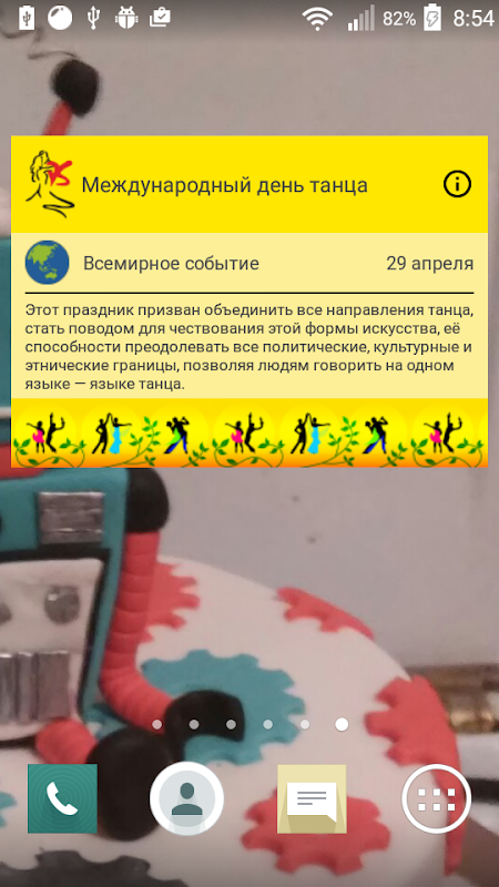 Виджет показывает значимые и интересные события из мира танцев, которые состоялись в этот день. Список событий постоянно пополняется и автоматически синхронизируется. Возможно вы узнаете об исторических фактах, которые имели значимое влияние на мир танцев: люди, фильмы, турниры, флешмобы и т.п.